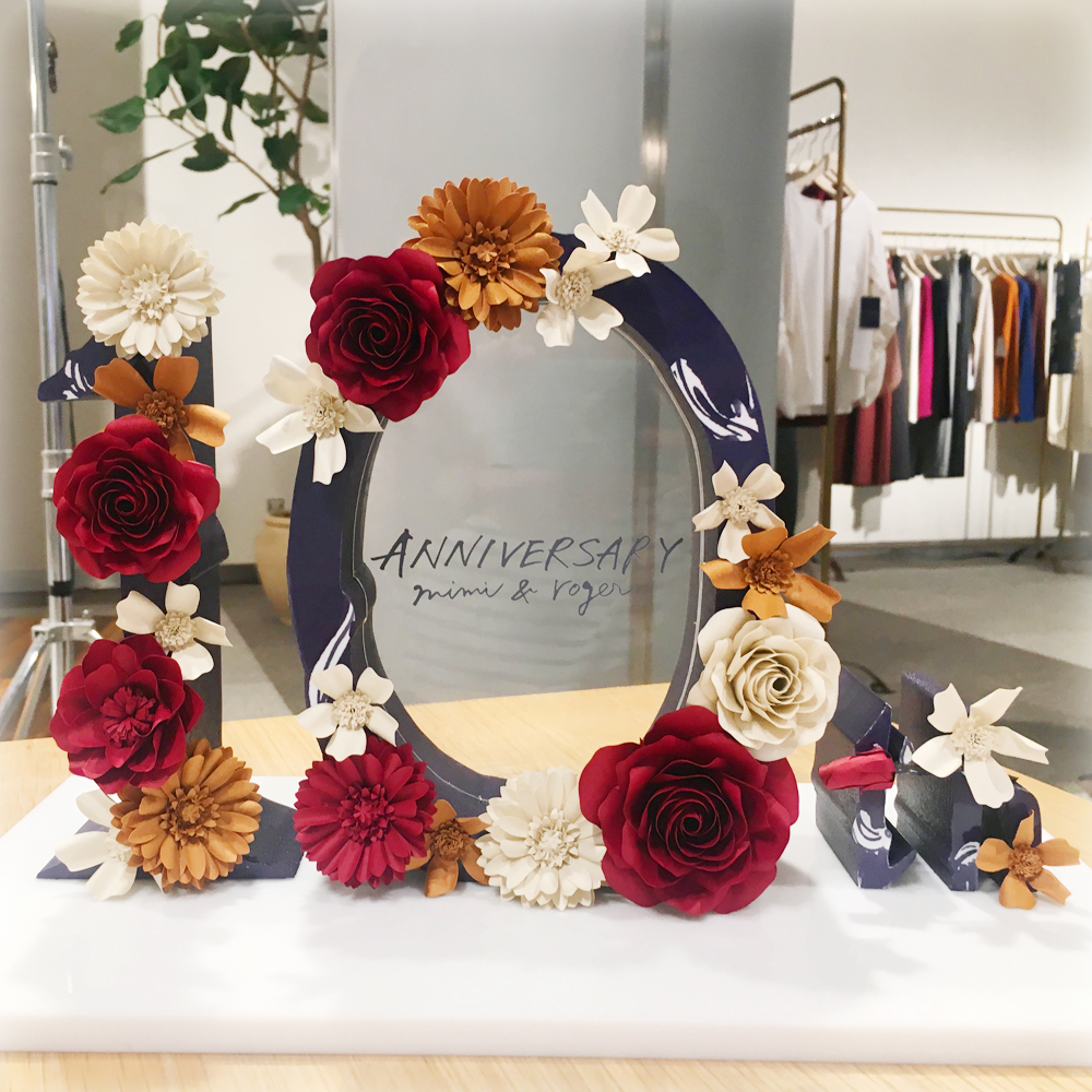 2018年にアパレルブランド「mimi & roger」様の10周年アニバーサリー展示会のロゴを飾るペーパーフラワーをお作りさせていただきました(お花の大きさは5~15cm)