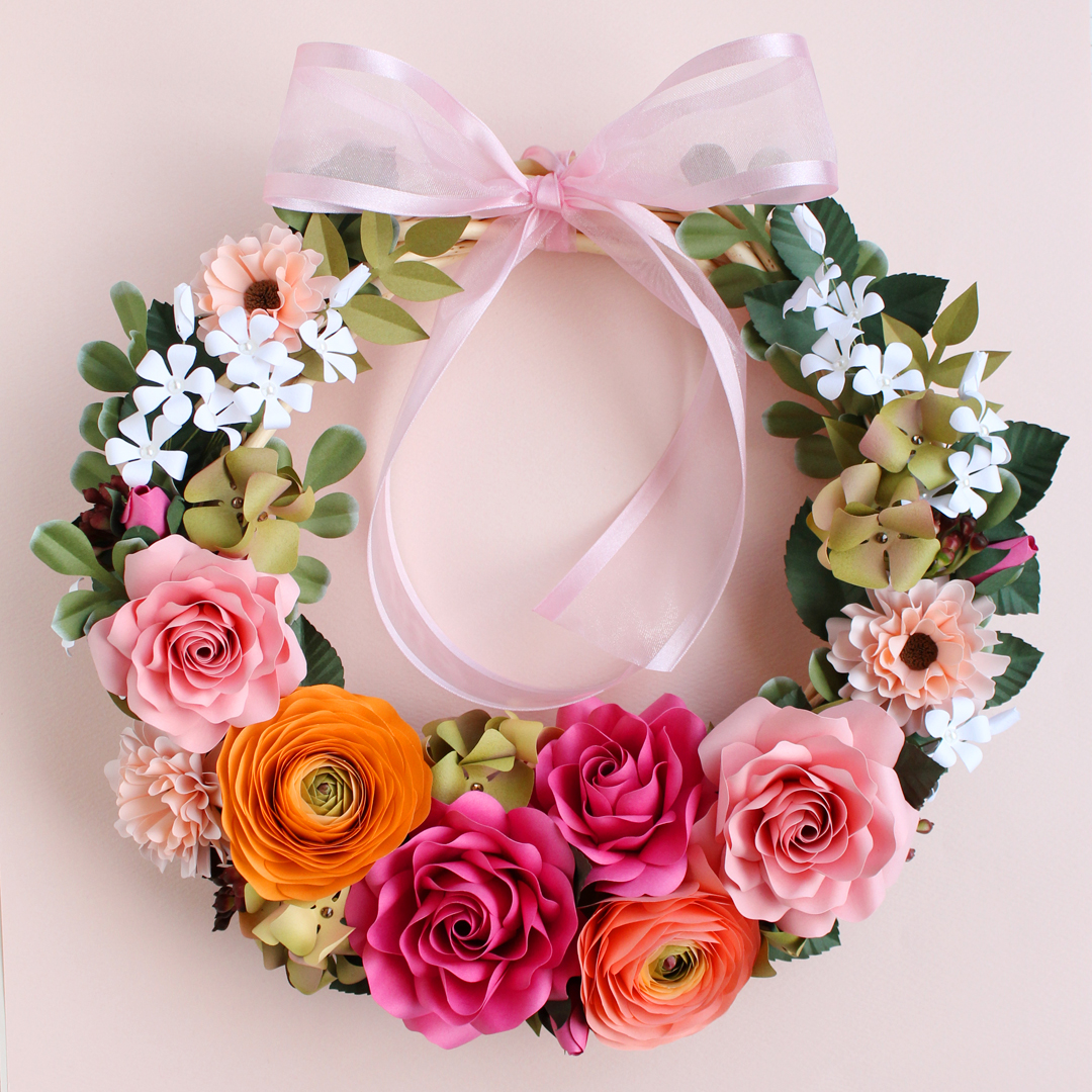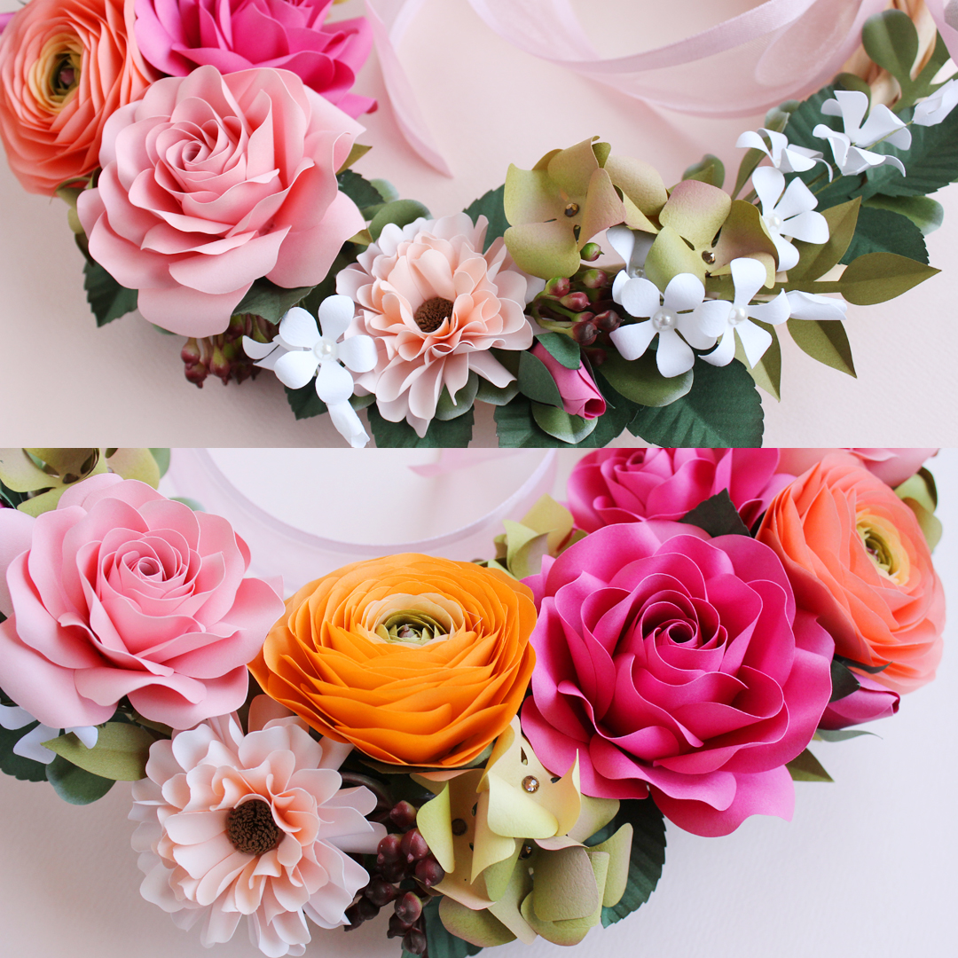 ご家族のお祝い用にお作りさせていただいたピンク&オレンジ系のペーパーフラワーリースです