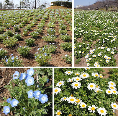 上の写真はみはらしの丘付近。ブルーのネモフィラと、真っ白なスノーポールが一面に咲いていて、熱心に写真を撮っている方も見かけました。