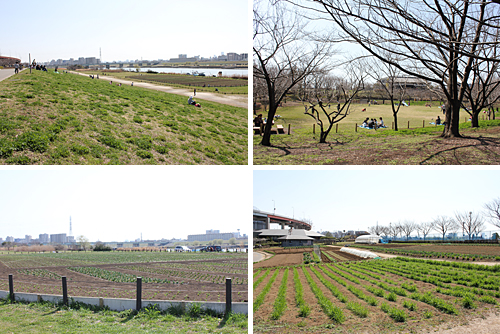 ・荒川土手はクローバーや草花などが生え始め、青々としてきました。川を眺めながらのんびりお弁当を食べている人も。今の時期、ブルーの小さい花を付けるオオイヌノフグリがたくさん見られます。